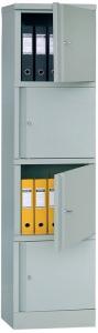 - Шкаф выполнен в виде металлической колонны с четырьмя независимыми отделениями для хранения. Каждое отделение имеет индивидуальную дверцу и запирается собственным замком.
